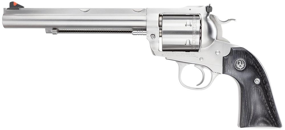 Ruger's Super Blackhawk revolver features a patented transfer bar mechanism and loading gate interlock which provide an unparalleled measure of security against accidental discharge. Its traditional western-style, hand-filling grip is comfortable and has natural pointing of any grip style. The Super Blackhawk also has cold hammer-forged barrel, adjustable rear and fixed front sights, and is reliable with coil springs throughout for durability. The Hunter model features patented integral mounts, machined directly on the solid-steel barrel rib which provides a stable mounting surface for scope rings. Included are scope rings. This model has a 7.5" stainless steel barrel, frame, and cylinder. It also has a Bisley black laminated grip and accept factory .44 Special cartridges, which deliver superb accuracy and milder recoil.