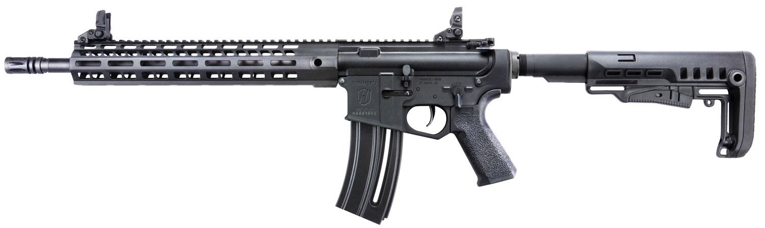 This Walther Hammerli Tac R1 rifle features a 5-position stock, aluminum upper and lower receiver, flip-up sights and a matte black finish.