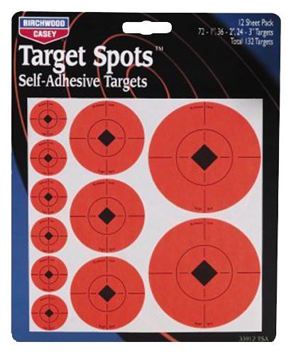 Convenient, self-adhesive, fluorescent red target spots in different sizes create instant bullseyes for all types of target practices. The high contrast, radiant red color lets you see a sharper sight picture and bullet holes more clearly for better scores and smaller groups. Designed for the avid shooters who need more than one size, this value pack assortment contains the three popular sizes for a full range of shooting activities. One package with three size target spots. Each page has 6-1", 3-2", and 2-3" spots, with 11 pages in each package.