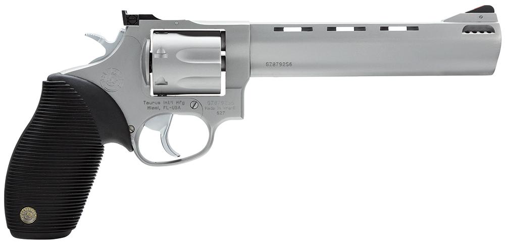 Extremely comfortable to fire and easy to control, the Tracker Series maintains a high level of accuracy, rock-solid performance, and near-indestructible construction. The Model 627 revolver 357 Magnum has a 7-round cylinder, and makes a practical choice for backpacks and tackle boxes, especially where there are bears and other predators around. It has a transfer bar safety as well as the Taurus Security System. The 627 features factory-tuned barrel porting and a gas expansion chamber for recoil, as well as the ergonomic, shock-absorbing Ribber grip. It has a matte stainless steel metal finish with a fixed front sight and adjustable rear sight. This model has a 6.5" barrel.