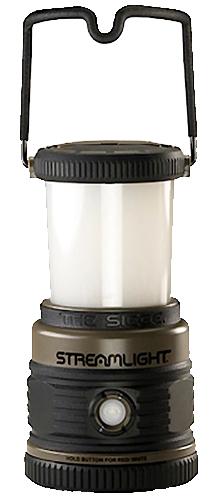 The Siege, by Streamlight, is a rugged, cordless, alkaline battery-powered lantern that provides 360 degrees of soft, even light that illuminates large areas. The white LEDs feature three output levels: high (340 lumens), medium (175 lumens), and low (33 lumens). The red LED operates in a night vision preserving mode (10 lumens of steady light) and a flash SOS mode for emergency signaling (10 lumens). The cover is removable to illuminate large areas, and the lantern can stand upright or hang from the D-ring on the base or top of the lantern to provide overhead light. The recessed power button prevents accidental actuation and features a battery level indicator. The Siege Lantern will float with the outer lantern globe in place, and it is waterproof to one meter.