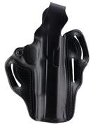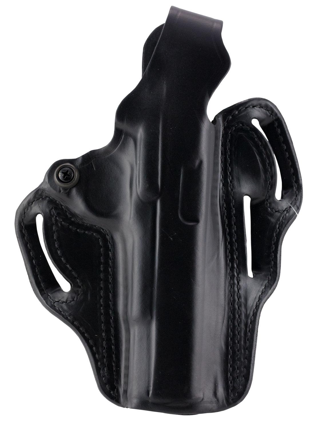 The firearm rides high and is presented at an optimum draw angle. Its thunb break and exact molding, together with a tension device, allows for a secure and highly concealable carry. This picture illustrates the three-slot model. Belt slots are 1 3/4" wide.