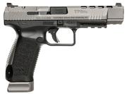 Century's Canik TP9SFx striker fire pistol comes with standard dovetail sight cuts, single action trigger, and a MIL-STD-1913 Picatinny rail. This model features Warren Tactical sights with a red and green fiber optic front. The rear sight is installed in a removable red dot cover to eliminate interference with certain red dot sights. It includes four red dot interface plates. It has a match grade barrel, loaded chamber indicator, reversible ambidextrous cocking lever, extended ambidextrous slide stop, and reversible magazine catch with two additional sizes. It includes two magazines, polymer holster with paddle/belt attachment, interchangeable backstraps, cleaning rod, and a brush. The TP9SFx has a black polymer frame, and a Tungsten Gray Cerakoted slide with forward slide serrations and lightning cuts.