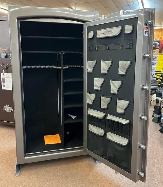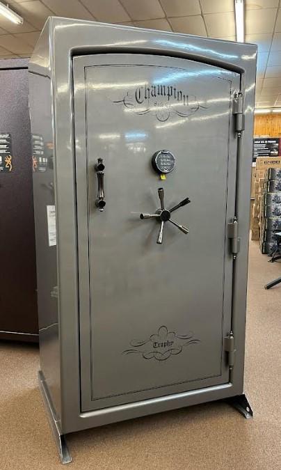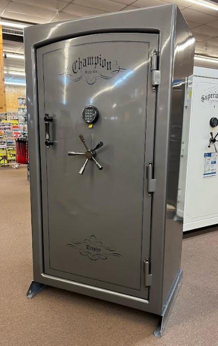 Call for delivery pricing and options. Champion Trophy 40 Gloss Platinum Paint with Black Chrome Hardware. SG Electronic Lock. Built with the same exacting precision and superiority as Champion’s higher-end models, the Trophy Series offers rugged protection. Its 11-gauge steel body, reinforced with a Double-Steel Door Casement™, provides a solid steel foundation. Its thick Double Plate Steel Door with full inner door steel and numerous 1¼”-diameter four-way active door bolts provide excellent security. The Trophy’s door defense system includes, Champion’s Auto-Relock™ system and Diamond-Embedded Armor Plate™. To protect from the hottest fires, it boasts a 1200°F 2-hour fire rating. The Trophy Series comes in high-gloss and textured finishes, with a velour-covered interior and convenient door organizer. Dimensions 37"x66"x28.5". Weight 900 pounds.