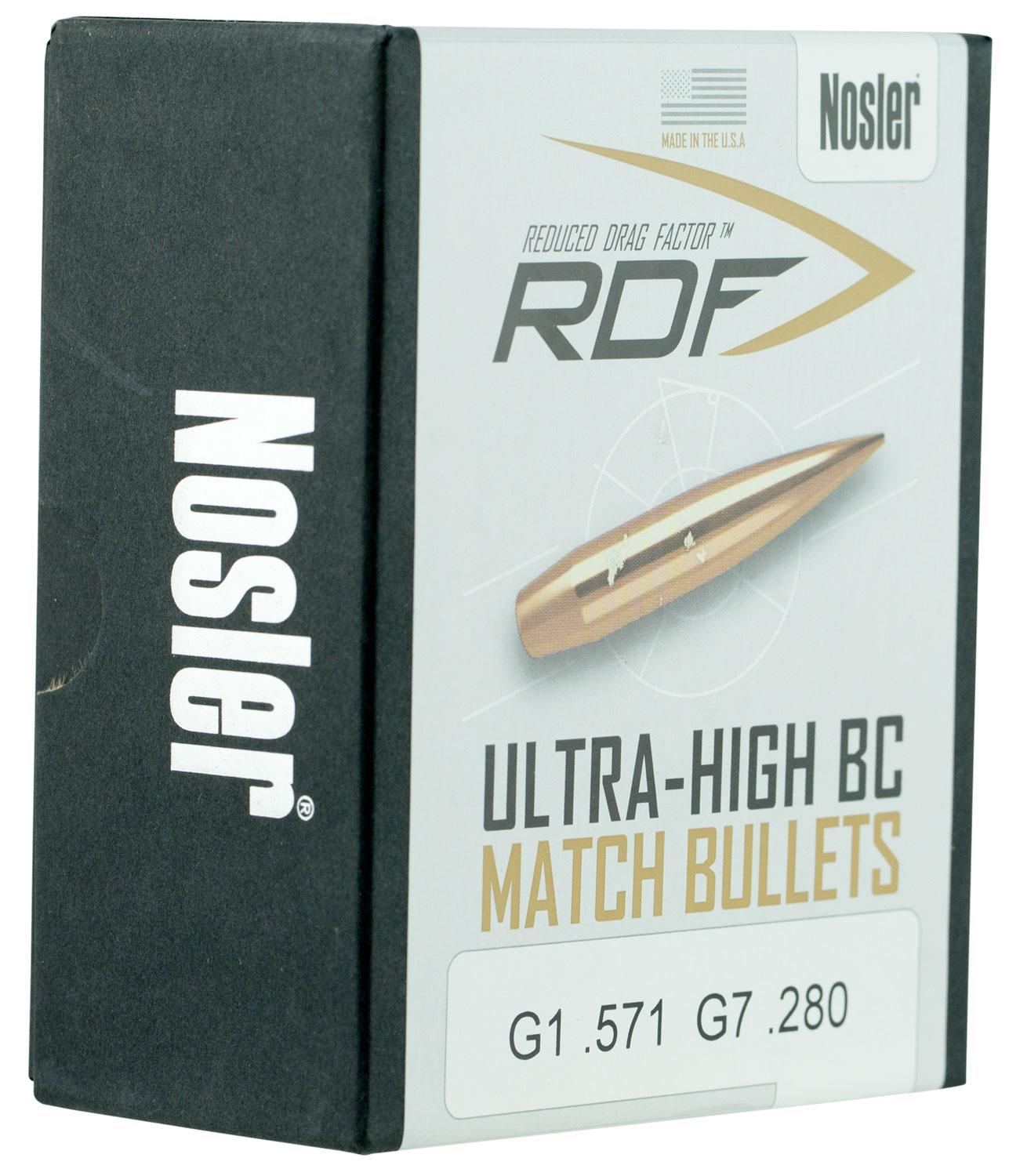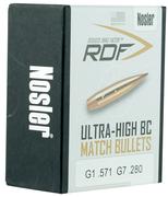 For those wanting to squeeze the most performance from their competition rifle, Nosler's RDF (Reduced Drag Factor) match bullet line is the ideal choice. The RDF line was designed from the ground up to provide exceptionally high BCs, which create the flattest trajectory and least wind drift possible. The keys to the RDF's outstanding performance are Nosler's meticulously optimized compound ogive and long, drag-reducing boattail, which make handloading a snap and create an incredibly sleek form factor. RDF bullets also have the smallest, most consistent meplats of any hollow point match bullet line, so there is no need to point or trim tips.