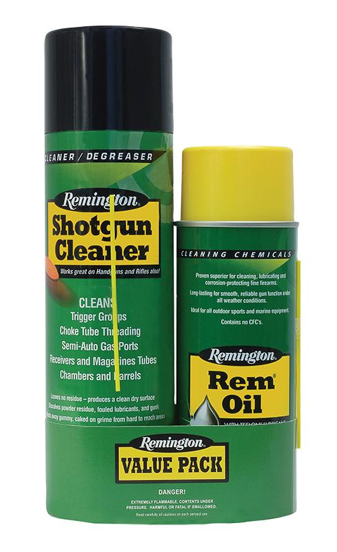 Remington Gun Care Value Pack Shotgun Cleaner and Rem Oil gun care products are packaged together in a convenient value pack.