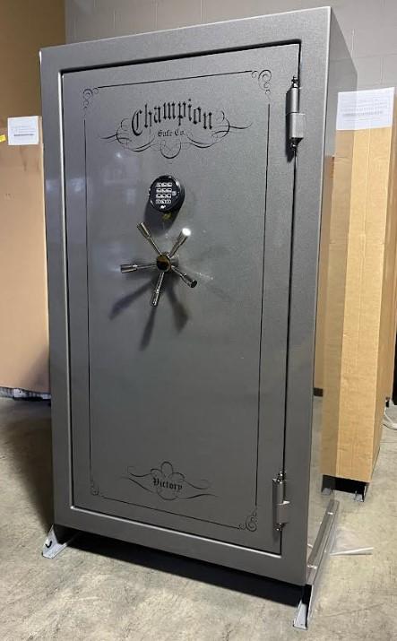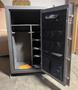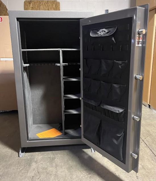Call for local delivery options and price. Gloss Platinum Paint with Black Chrome Hardware. SG Electronic Lock. External Dimensions: 34" W x 60" H x 24.5" D. Long Gun Capacity: 32. Weight: 650 lbs. Fire Rating: 1200 degree for 75 minutes. 12-Gauge Steel Walls. 4"-Thick Double Plate Steel Door. 12-Gauge Outer Steel, Full 14-Gauge Inner 7/16" Reinforced Door Edge.