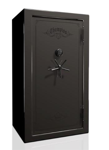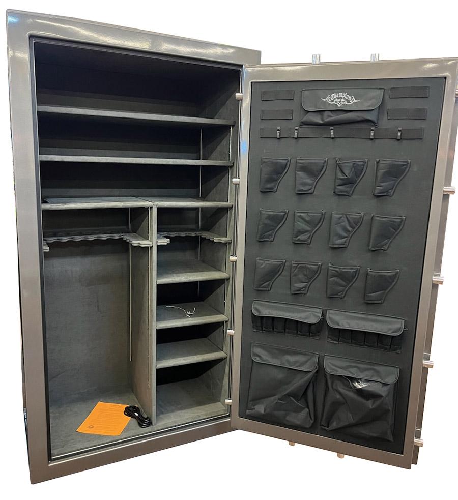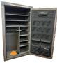 Call for local delivery options and price. Gloss Platinum Paint with Black Chrome Hardware. SG Electronic Lock. External Dimensions: 40" W x 72" H x 28.5" D. Long Gun Capacity: 52. Weight: 900 lbs. Fire Rating: 1200 degree for 75 minutes. 12-Gauge Steel Walls. 4"-Thick Double Plate Steel Door. 12-Gauge Outer Steel, Full 14-Gauge Inner 7/16" Reinforced Door Edge.