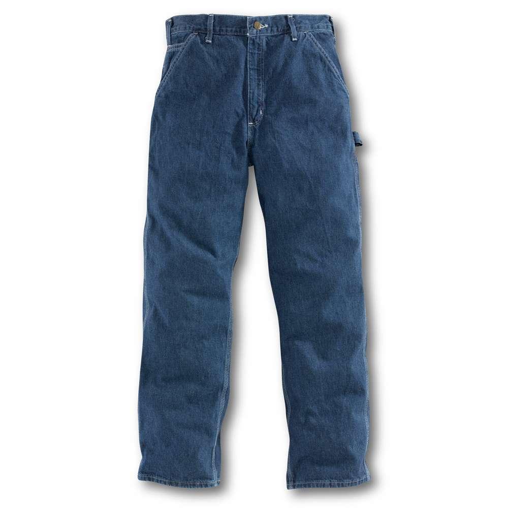 Carhartt Loose-Original Fit Double Front Logger Dungaree Jean. 15-ounce, rigid, 100 percent cotton denim. Double front with cleanout openings that accommodate knee pads. Multiple tool and utility pockets. Left leg hammer loop. Sits at the waist. Straight leg opening.