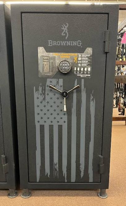 Call for delivery options and pricing. Appreciate the straightforward security of a Yellowstone® 23 safe, complete with a Quick Access Barrel Rack, convenient felt shelving, Force Deflector Locking System, plus a 12-gauge steel body and 10-gauge partial inner plate. Black Diamond Textured Paint with Flag on door. With an electronic lock. Grab and go easily, and enjoy peace of mind while you’re out. Dimensions 20X58X29.5. Weight 490 pounds.