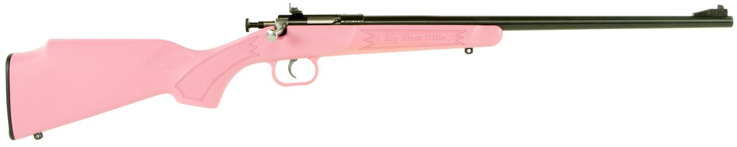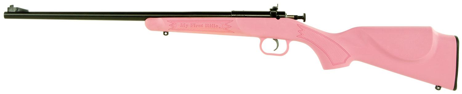 Crickett's Single Shot 22 LR rifle features a pink synthetic stock, adjustable rear sight, and a bolt action constructed from alloy nickel plated steel.